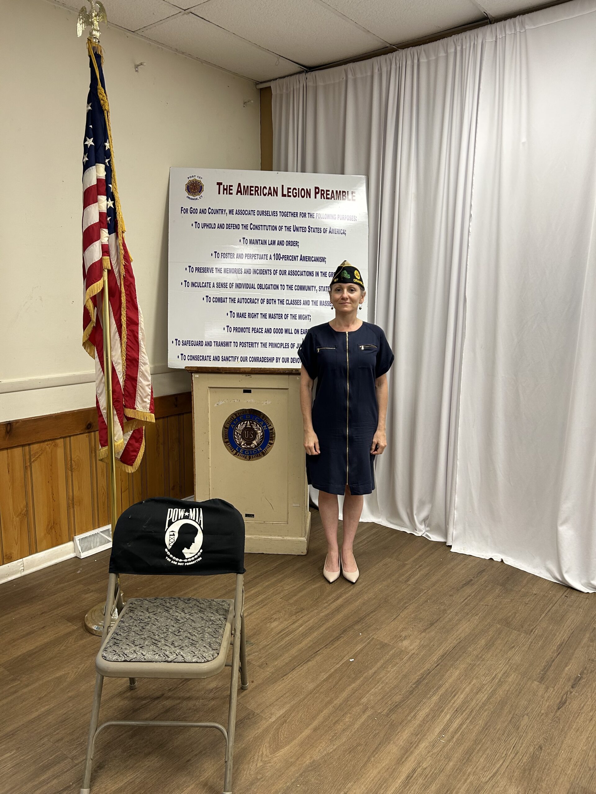 Post 127 of the American Legion in Orange inducted its newest member, Bett DeSantis, at the group’s June meeting. DeSantis is a US Navy veteran who moved to town two years ago. She is a member of the Garden Club of Orange and is active in her local church. Photo by Alan Scott.