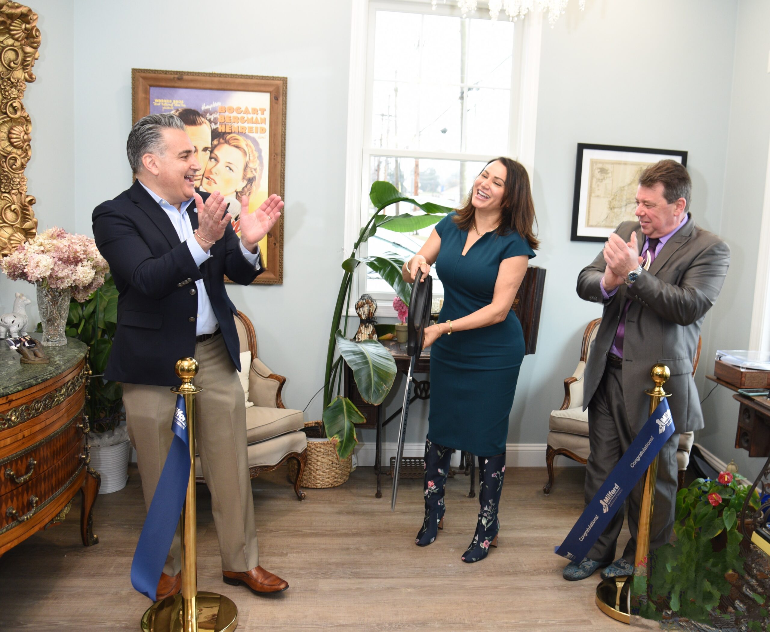 The Milford Regional Chamber of Commerce held a ribbon-cutting on March 24 to celebrate the grand opening of Casablanca Tailor Shop’s new location at 240 Broad St. in downtown Milford. Founded by master tailor Soumia Rossetti, the shop offers expert craftsmanship and haute couture expertise. From left: Mayor Tony Giannattasio, Rossetti, and MRCC Director Simon McDonald. Photo by Robert Creigh.